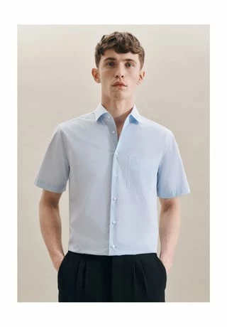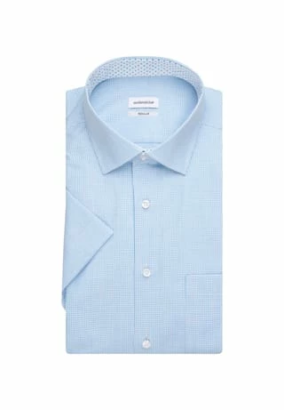 Das kurzärmelige Seidensticker Regular Herren-Hemd ist ein geschmackvoll inszeniertes Konzept. Es überzeugt optisch mit einem modern interpretierten Karo-Muster, das in Kombination zu unifarbenen Anzügen zum Eyecatcher wird. Optimale Trageeigenschaften besitzt das Konzept dazu dank der bügelfreien Baumwoll-Popeline und der moderne Schnitt sorgt für eine ideale Passform bei geradem Schnitt. Der Ausputz im Business-Kent-Kragen vollendet das gelungene Konzept.