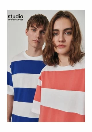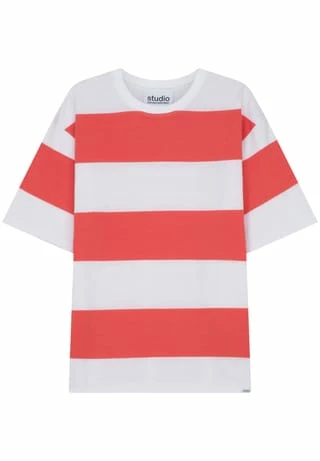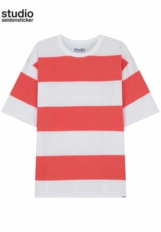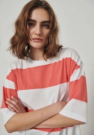 Oversized Fit T-Shirt – softe Plain-Knitted-Jersey-Qualität. Rundhalsausschnitt und Streifen Design.