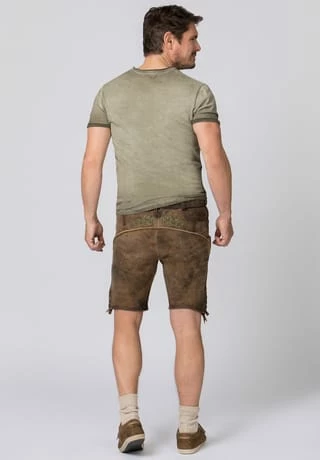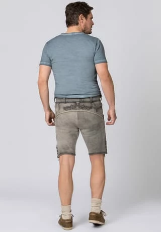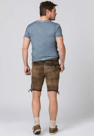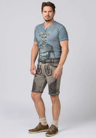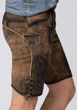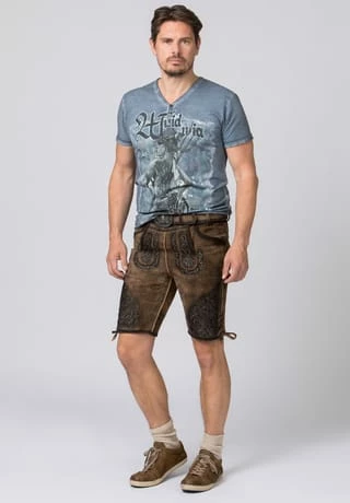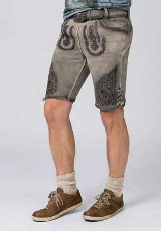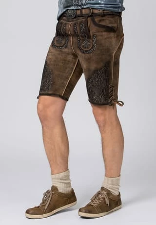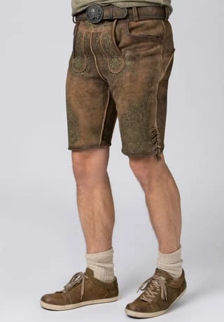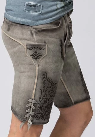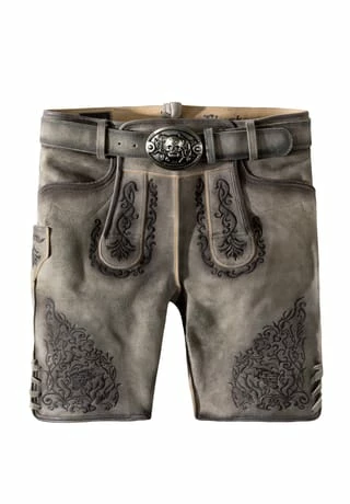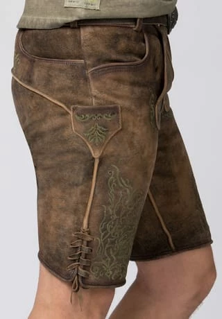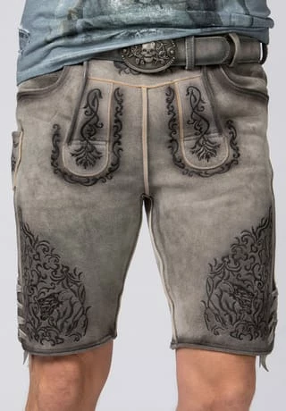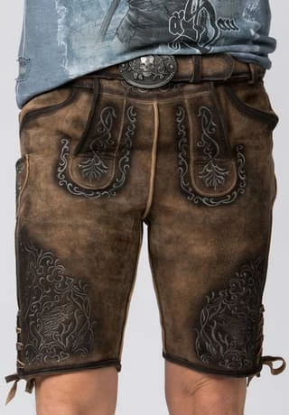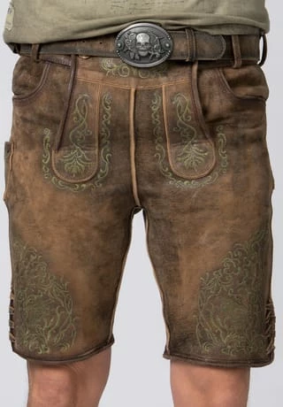 Lederhose Finstawoid von Mountain Rocker. Die kurze Lederhose aus hochwertig gegerbten Wildbock Leder in Hirschoptik zeichnet sich durch den ausgefallenen Antik-Look aus und gehört zu unseren Lieblingsstücken. Die stylische Stickerei mit angesagtem „Crow-Motiv und klassischen Ranken“ ist markant und zieht jede Menge Blicke auf sich. Den Innenbund ziert die Stickerei „Finstawoid“ die das Trendlabel prägt. Die außergewöhnliche Strukturierung des Leders mit antiken Farbverläufen verleiht dem Modell eine einzigartige Note und macht sie zu etwas ganz Besonderem. Die Lederhose wird mit einem passenden, hochwertigen Ledergürtel und der unverkennbaren Schließe von „Mountain Rocker“ geliefert.